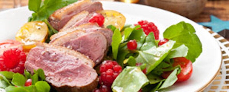 - Hoofdgerecht: eendenborst op waterkerssalade: de vettigheid van de eend lost op door de droge smaak van champagne.