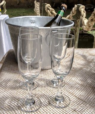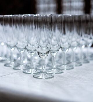 - Zorg dat je minimaal 30 identieke coupeglazen in huis hebt en een stevige tafel. Om te schenken kun je rekenen op zo’n 6 tot 8 flessen.
