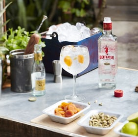 - Vul een groot glas met ijsblokjes en voeg 35 ml Beefeater gin en 100 ml Fever-Tree Tonic toe.