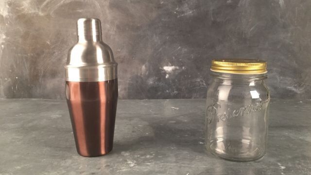 Liever shaken, not stirred? Dat kan in een cocktailshaker, maar gaat ook prima in een waterfles of mason jar (een glazen bewaarpot met een schroefdop). Kies er een met een grote opening, dan passen alle ingrediënten erdoor. Dop erop en shaken maar.