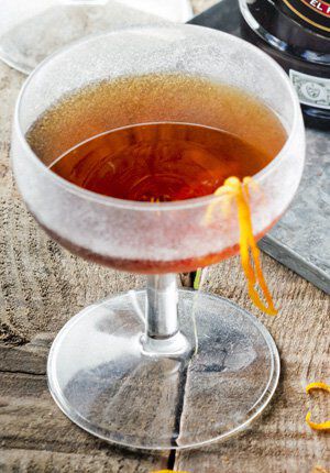 - Schenk uit en zeef in een copa glas met ijsblokjes en garneer met een dun gesneden schilletje sinaasappel.