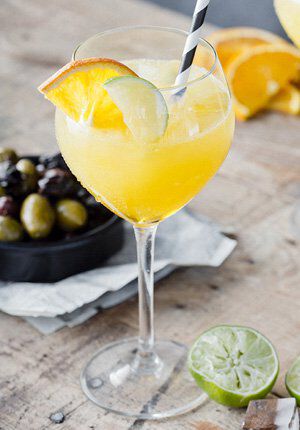 - Roer en garneer met twee schijfjes sinaasappel.