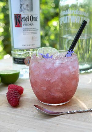 - Plet de frambozen samen met de suiker en violetsiroop in een laag glas of tumbler.