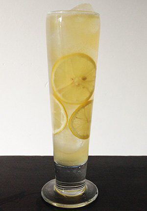 - Voeg alle ingrediënten samen in een cocktailshaker, behalve de limonade en de schijfjes citroen.