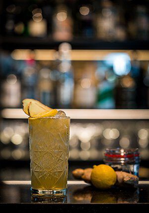 - Top de cocktail af met sodawater en garneer de cocktail met een schijfje citroen en 2 schijfjes gember.