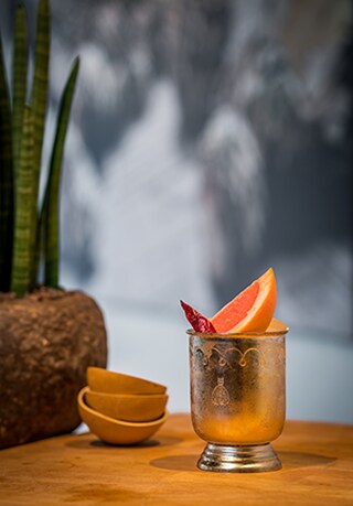 - Garneer de Mezcal Mule met een stukje Spaanse peper en een stukje grapefruit.