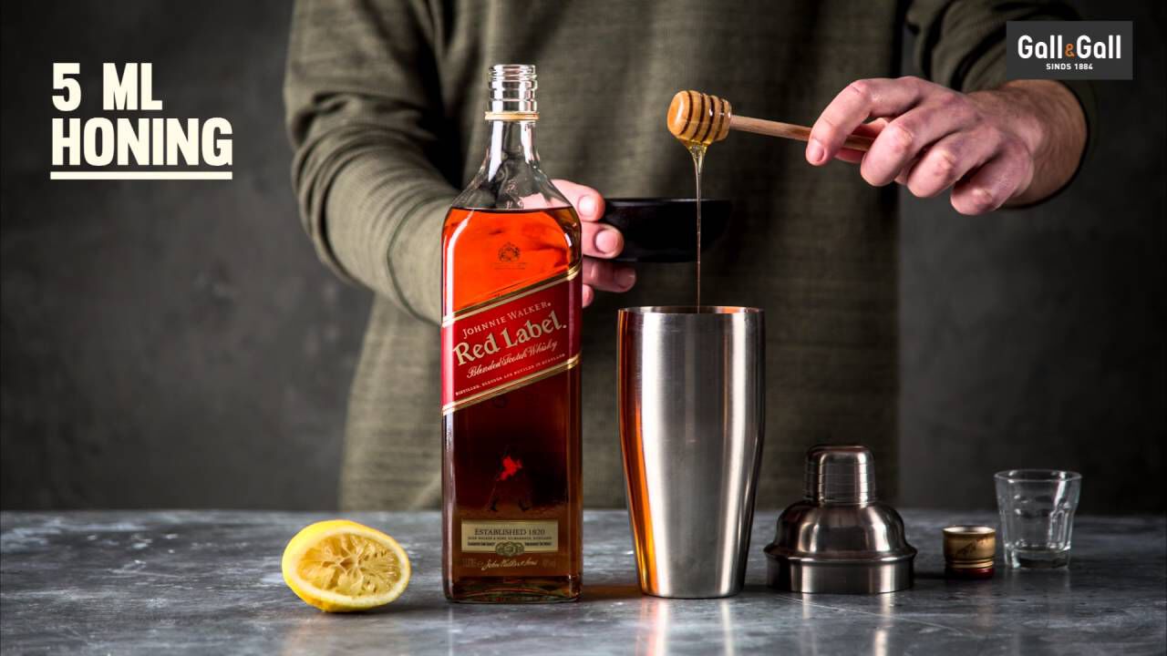 - Voeg de Scotch whisky, honing siroop, citroensap en gembersiroop toe aan een shaker.