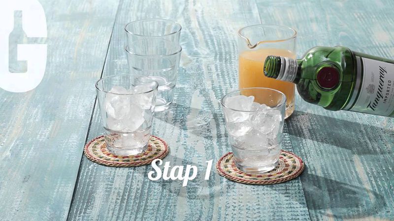 - Voeg 50 ml Tanqueray gin en 50 ml vers sinaasappelsap toe.
