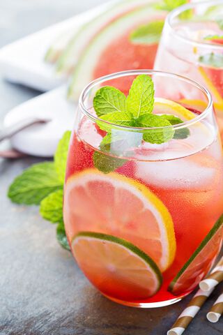 - Schenk de massa in mooie glazen en garneer met een blaadje munt of schijfje watermeloen.