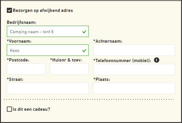 - Vul je bezorggegevens in bij afwijkend afleveradres. In dit geval dus: je tentnummer, of staplek