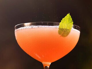 4. Giet tot slot door een fijn theezeefje in een gekoelde kleine coupe. Garneer met een muntblaadje.