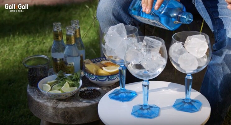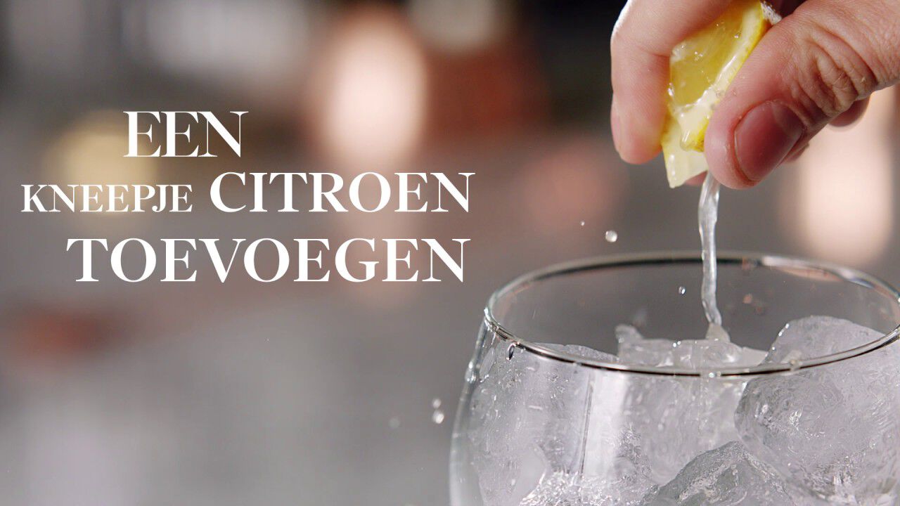 - Vul een groot glas met ijsblokjes en voeg 50 ml Bombay Sapphire East gin en 100 ml Fever-Tree Tonic toe.