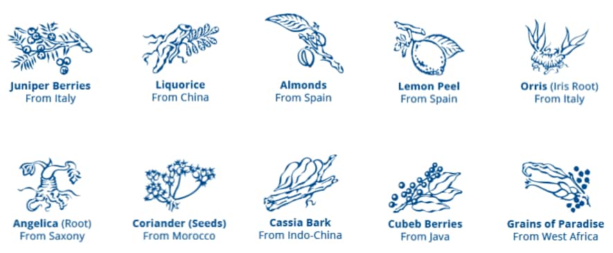 Jeneverbessen - zoethout - amandelen - citroenschil - iriswortel - engelwortel - koriander - kassiebast - staartpeper - malaguenapeper.