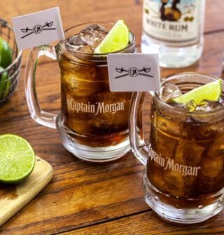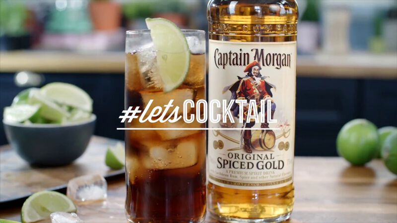 - Vul het met ijsblokjes, 40 ml Captain Morgan Original Spiced Gold or 0.0% en 150 ml cola.