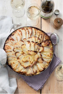 - Schil 3 grote vastkokende aardappels in dunne plakjes. Leg ze dakpansgewijs op de ovenschotel. Besprenkel met wat olijfolie en bestrooi met peper en zout.