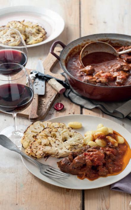 - Bak in het over- gebleven braadvet 1 grote gesnipperde ui en 2 teentjes geperste knoflook zachtjes 5 minuten aan. Voeg 1⁄2 tl chilipeper, 2 el bruine suiker en 1 el tomatenpuree toe en bak 1 minuut mee. Schenk er 800 g gepelde tomaten uit blik en 250 ml runderfond bij. Doe het aangebraden vlees terug in de pan. Breng aan de kook. Doe het deksel op de pan, zet op het kleinste pitje en draai het vuur laag. Laat ca. 2 uur zachtjes garen.