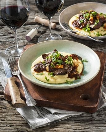 Runderstoof in rode wijn op romige polenta