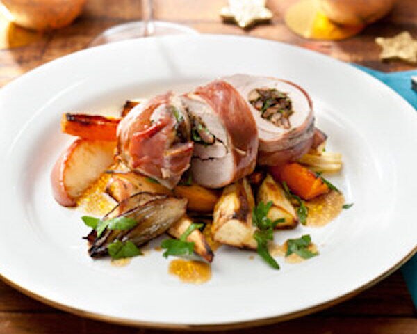 Mini-rollade varkenshaas en geroosterde wortelgroenten