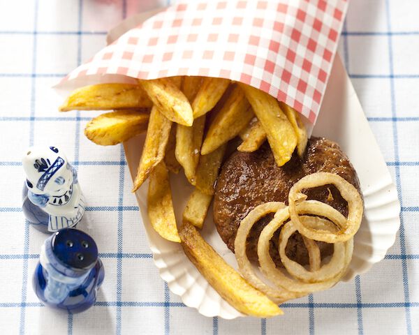 - Verhit de frituurolie tot 180 °C. Bak de patat in kleine porties in 2 minuten goudbruin en laat uitlekken in een vergiet met keukenpapier. Bestrooi met zout. Leg de satéburgers op de borden, verdeel de uiringen erover en schep er wat patat naast.