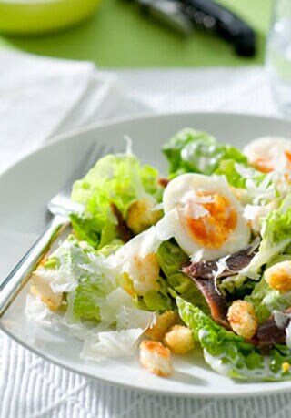 Heerlijk, een maaltijdsalade met knapperige croutons. De klassieke combinatie van ansjovis, frisse sla en een vers eitje is het geheim van dit recept