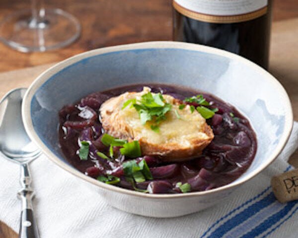 - Verhit de boter in een soeppan met dikke bodem. Fruit de uiringen in ca. 3 minuten op halfhoog vuur glazig. Voeg de suiker toe en bak ca. 1 minuut mee op hoog vuur. Voeg de port en balsamico-azijn toe en laat het uimengsel ca. 30 minuten, zonder deksel, zachtjes fruiten tot de uien licht karamelliseren. Voeg de bouillon en de laurierblaadjes toe. Laat de soep nog 20 minuten zachtjes koken, zonder deksel, zodat alle smaken goed doortrekken.