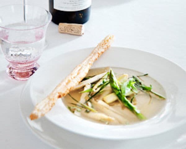 - Verdeel de asperges over 4 borden en schep de hete bouillon erover. Garneer met de dragon.