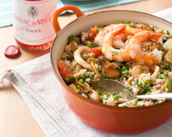- Dek de paella af met een theedoek en laat hem nog ca. 5 minuten staan, zodat de rijstkorrels van elkaar loskomen. Serveer met partjes citroen.