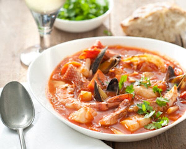 - Schep de gemengde visfilet, de mosselen en gamba’s erbij. Laat in ca. 5 minuten de vis zachtjes gaar worden. Roer niet teveel, anders valt de vis uit elkaar. Breng op smaak met zout en versgemalen peper. Bestrooi met 5 g peterselie. Lekker met versgebakken ciabatta brood.
