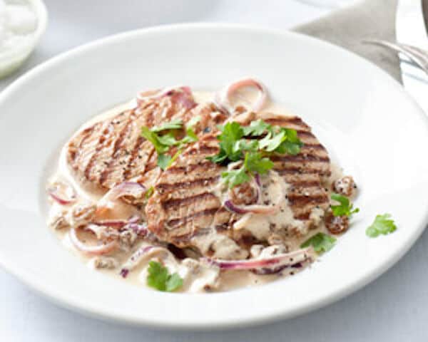 - Verhit tegelijkertijd 50 g boter in een koekenpan. Snijd ½ rode ui in halve ringen en bak deze ca. 2 minuten. Voeg de marsala met rozijnen toe. Breng het massala-uienmengsel aan de kook en laat het in ca. 2 minuten inkoken tot een licht stroperige saus. Roer de crème fraîche erdoor. Breng op smaak met zout en peper.