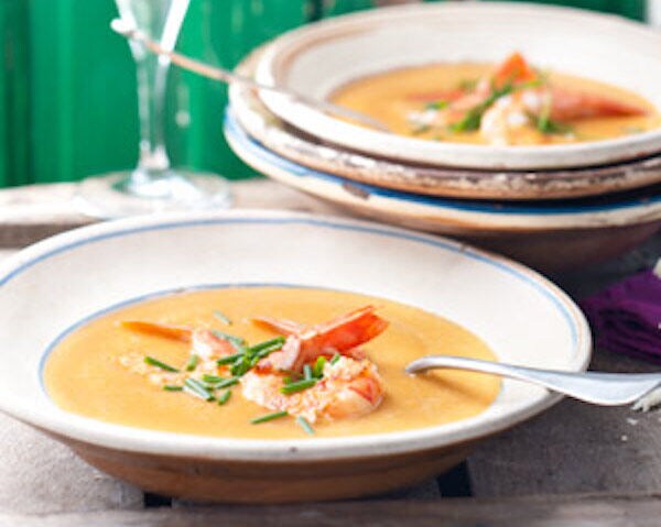 - Schep de soep in vier diepe borden. Leg de gamba’s in het midden. Bestrooi met de bieslook.