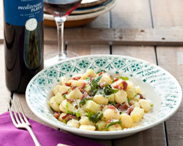 - Kook de gnocchi in 4 à 5 minuten beetgaar (als de gnocchi bovendrijven zijn ze gaar). Giet af en schep de zoete aardappel en het spekmengsel erdoor.