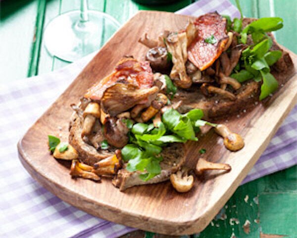 - Bak in een andere koekenpan de bakbacon bruin en knapperig. Rooster het meergranenbrood. Leg op elk bord een snee geroosterd brood. Verdeel er de waterkers over en beleg met het paddenstoelenmengsel. Leg er ten slotte de plak bacon op.