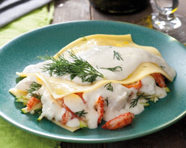 - Verwarm vier borden en leg op elk bord een half lasagneblad. Verdeel de helft van de geraspte courgette, 1/3 deel van de vis-roomsaus, de helft de rivierkreeftjes en de verse dille over de vier bladen en dek dit af met een half lasagneblad. Herhaal dit een keer. Dek af met de laatste lasagnevellen, de rest van de vis-roomsaus en nog wat verse dille en serveer direct.