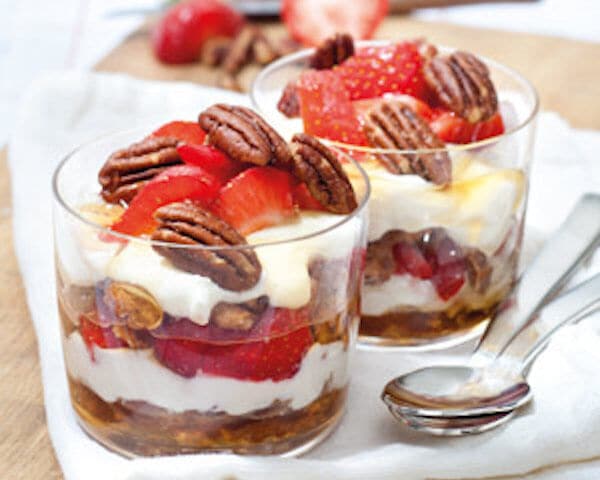 - Schenk voordat je de laatste laag aardbeien over de glazen verdeelt, wat honing over het mascarpone-yoghurtmengsel.