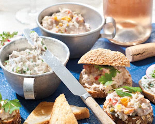 - Laat 1 blikje witte tonijn (duurzaam gevangen) uitlekken in een zeef. Haal de vis uit elkaar en doe in een kom. Voeg toe: 2 el mayonaise, 1 el tomatenketchup, 1 tl Dijonmosterd, 1 zeer fijn gesneden sjalotje, 2 el kappertjes, 1/3 fijngesneden rode paprika en de stukjes hardgekookt ei. Roer goed door elkaar en zet even apart om de smaken te laten intrekken.