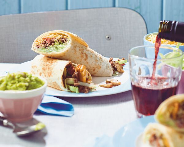 - Verwarm de tortilla’s volgens de aanwijzingen op de verpakking. Doe op elke tortilla 1 eetlepel zure room en wat ijsbergsla. Schep in het midden van elke tortilla een deel van het gehaktmengsel, van de gebakken paddenstoelen en wat geraspte kaas. Rol ze op. Serveer met de rest van de ijsbergsla, zure room en geraspte kaas.