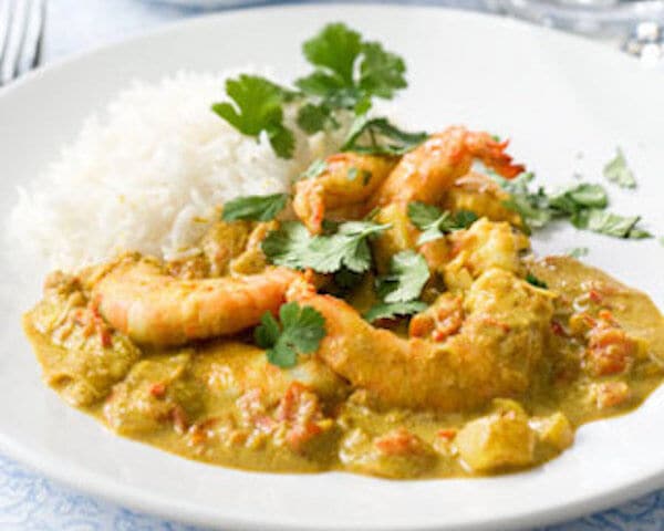 - Doe vlak voor het serveren de gamba’s in de saus. Giet de kokosmelk erbij. Roer door en laat warm worden.