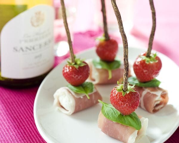 Verse geitenkaas met parmaham en aardbeien op een stokje