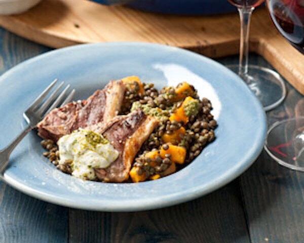 - Verdeel de linzen met zoete aardappel over de borden en leg op elk bord 2 lamskoteletjes. Meng 8 volle el pesto met de Griekse yoghurt en verdeel over de borden. Serveer de overgebleven pesto in een kommetje.