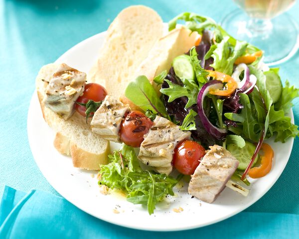 - Rijg de tonijn en cherrytomaatjes om en op aan 4 spiesjes. Verwarm de grillpan of ovengrill voor op de hoogste stand. Grill de tonijnspiesjes in ca. 4 minuten rondom goudbruin, zo dat de tonijn nog rosé is van binnen.