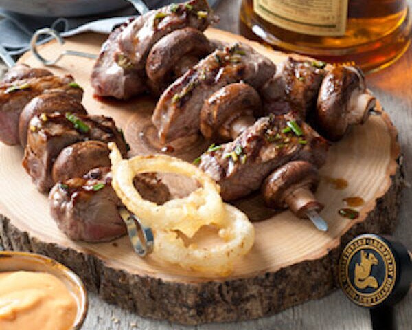 - Gril de spiezen 8-10 minuten tot er op alle vier de kanten mooie grillstrepen staan en het vlees van binnen rosé is. Lekker met gefrituurde uienringen en whisky-cocktailsaus.