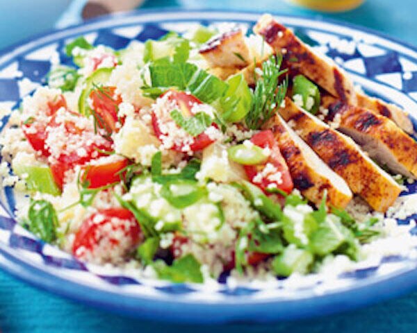 - Meng de couscous met de bosui, de tomaat, de citroen, de verse kruiden en de komkommer. Voeg eventueel een extra scheut olijfolie toe. Breng op smaak met zout en peper. Verdeel over vier borden.