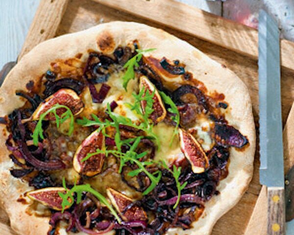 - Verwarm de oven voor op 250 °C. Bestrijk de pizzabodems met de uienspread. Verdeel de mozzarella erover en besprenkel met olijfolie. Bak de pizza’s onder in de oven in 12-15 minuten goudbruin. Leg na 10 minuten baktijd de vijgen erop. Haal de pizza’s uit de oven en garneer ze met de rucola.