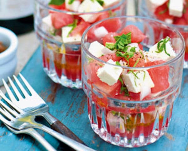TIP: maak er een kleurig dessert van door de feta te vervangen door stukjes gele honingmeloen, groene galiameloen en een oranje cuantaloupe meloen.