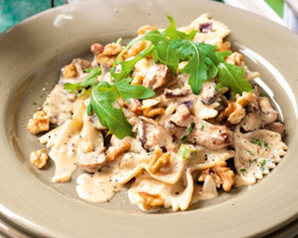 - Schep de pasta in vier pastaborden. Garneer met de walnoten en de rucola.