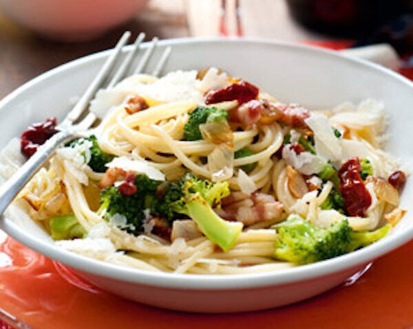 - Verhit de olijfolie in een wok. Bak de pancetta, ui en knoflook 3 minuten. Roer de broccoli en zongedroogde tomaatjes erdoor en bak 5 minuten mee.