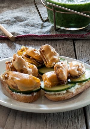 Bedek helemaal met flinterdunne plakjes komkommer. Leg er een handje uitgelekte mosselen op en bestrooi met wat korianderblaadjes.