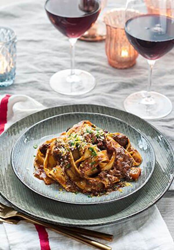 - Kook 300 g papardelle (brede lintpasta) beetgaar, schep de saus door de pasta en leg op voorverwarmde borden een mooie krul lintpasta met ragú. Strooi er wat gremolata overheen.