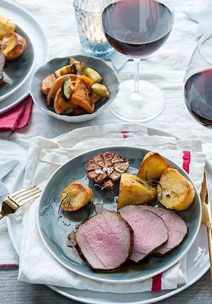 - Haal de rosbief uit de oven en laat nog 10 minuten rusten onder aluminiumfolie. Verhoog de oventemperatuur naar 225 °C. Snijd het vlees in dunne plakken en serveer met wat teentjes zachte knoflookpuree uit de gehalveerde bollen, de geroosterde aardappeltjes en wat groenten als geroosterde pompoen of een mooie salade.