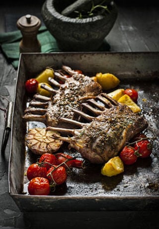 Kerst: Lamsrack met aardappel, tomaten en gepofte knoflook